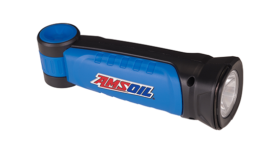 Not all flashlights are created equal; this AMSOIL flashlight provides multiple ways to illuminate hard-to-reach areas. A rotating COB light turns on when opened (270 Lumens), while an LED light on the bottom can be turned on with a button (87 Lumens). A magnet and a fold-away hook provide multiple mounting options. It’s powered by three AAA batteries (included).