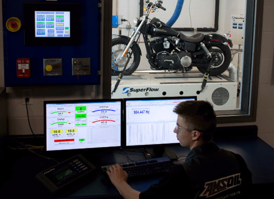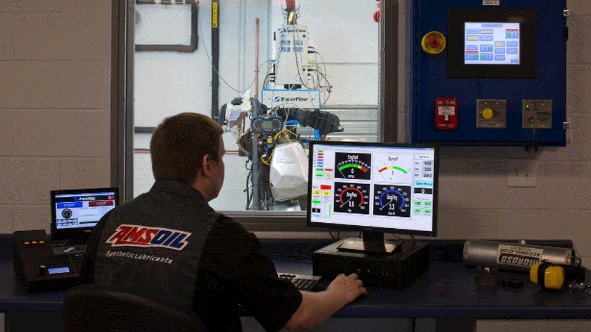 You’ll find out that the AMSOIL dyno consists of three cells, each with water systems, air systems and fuel systems to support whatever type of testing we’re doing. On any given day, you might hear a two-stroke snowmobile engine in full-on “braaap” mode, a V-twin motorcycle rumbling away or a V-6 howling like a banshee.