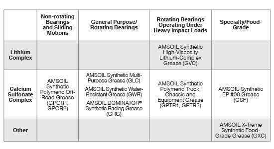 Use the table below as a guide for selecting the proper AMSOIL synthetic grease based on application. For questions about AMSOIL grease recommendations, contact AMSOIL Technical Services ([email protected], 715-399-8324).