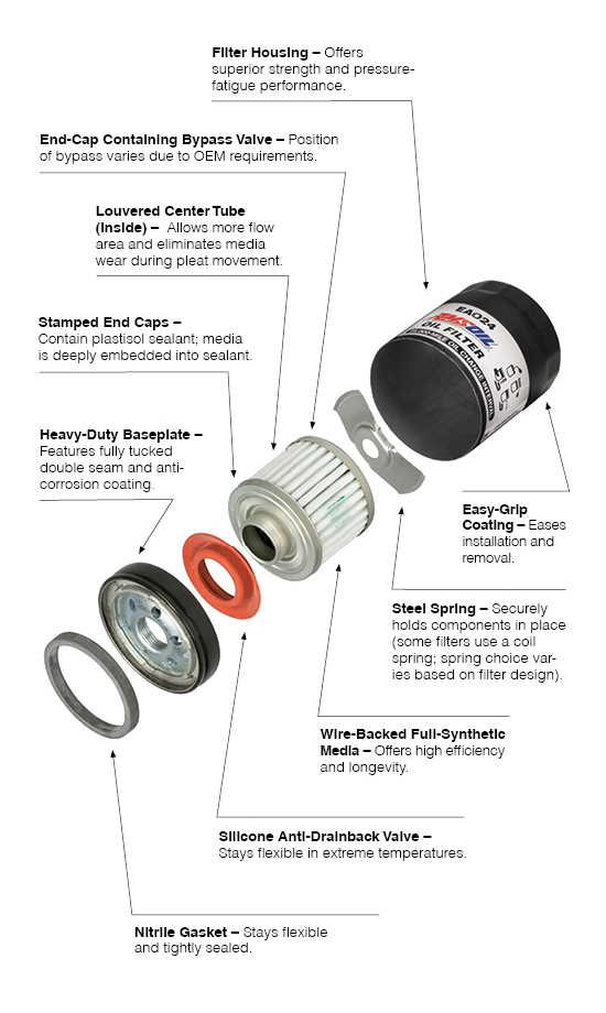 AMSOIL Oil Filters are constructed with nitrile gaskets that remain flexible and have been tested to extreme distances in severe environments. They feature fully tucked seams, a molded element seal, roll-formed threads and a long-lasting, premium-grade silicone anti-drainback valve.