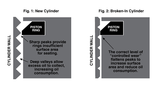 Insufficient break-in leaves peaks that prevent proper ring seating and allow excess oil to burn during combustion. Too much break-in wear can cause glazing that prevents oil from lubricating the cylinder wall. The friction-modifier-free formula of AMSOIL Break-In Oil allows the sharp peaks on honed cylinder walls to partially flatten. This increases the surface area for the rings to seat against, forming a dynamic seal that boosts compression, horsepower and torque.