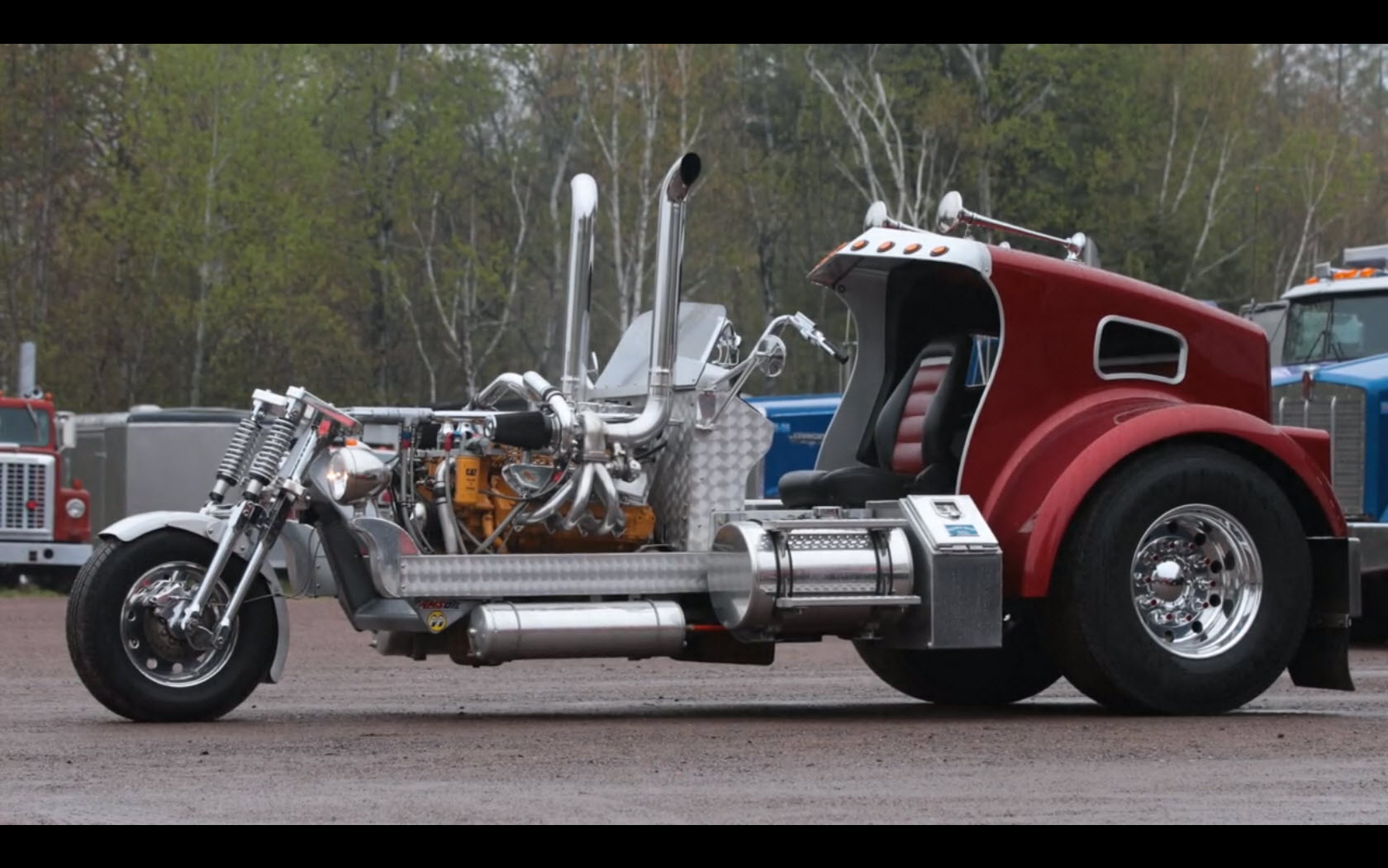 But his most famous creation may be the semi-truck he converted into a motorcycle/trike. Words can’t do it justice – you have to see it for yourself.